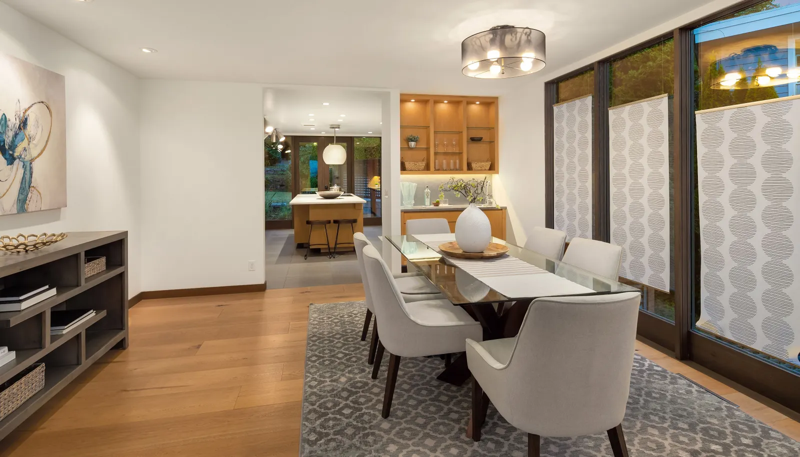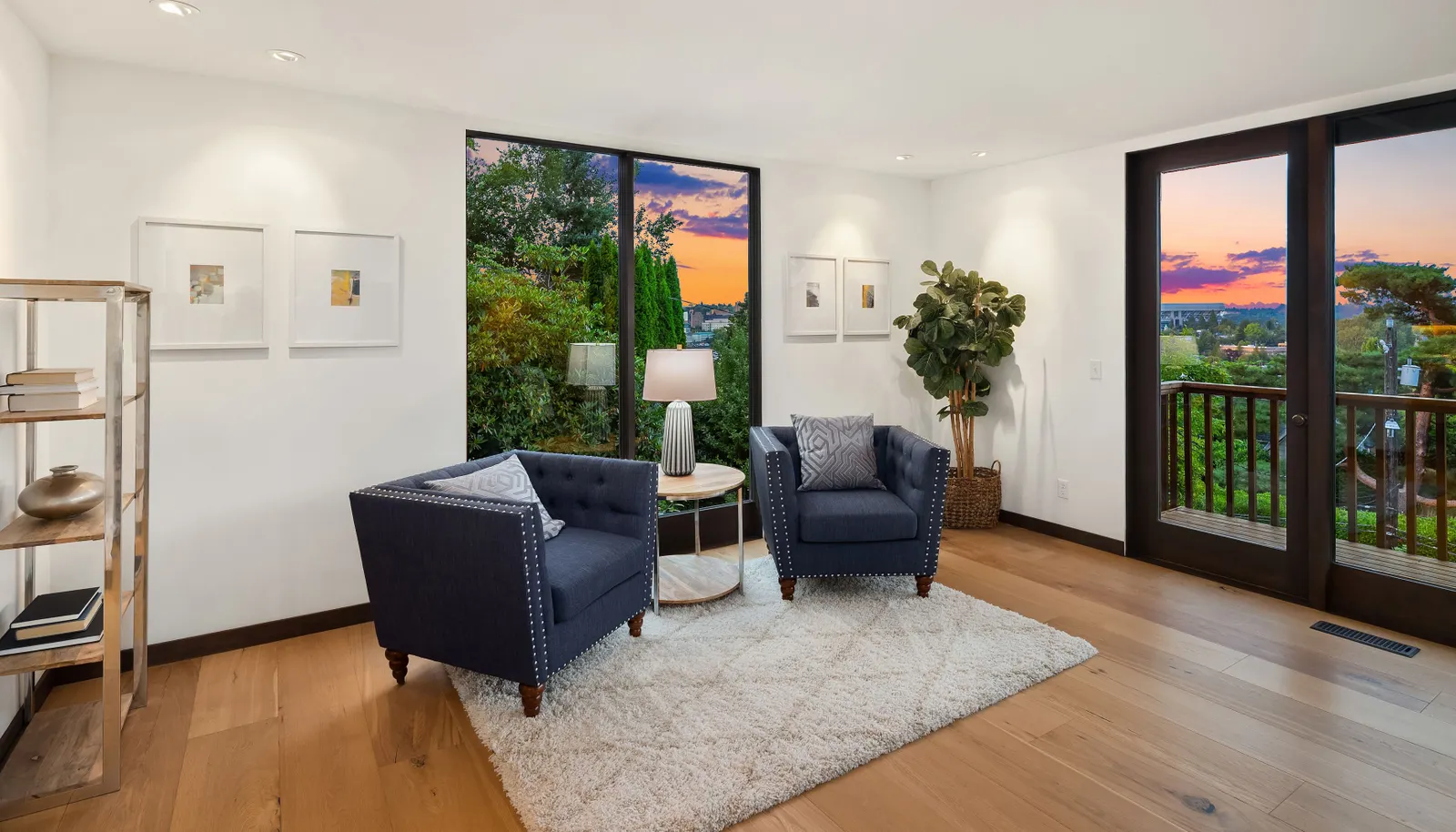 This west-facing grand-piano sized living room allows for sunny skies, stunning sunsets, and breathtaking views through its walls of glass.